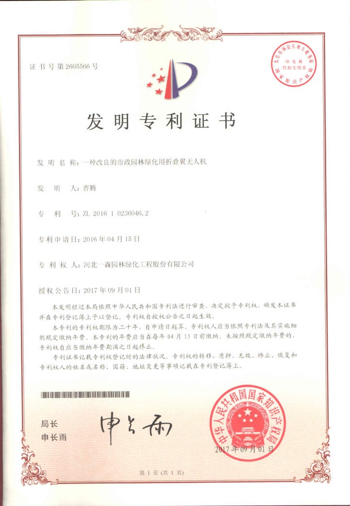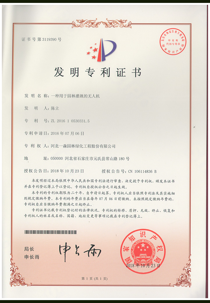 “一種用于園林灌溉的無(wú)人機(jī)”發(fā)明專利證書(shū)