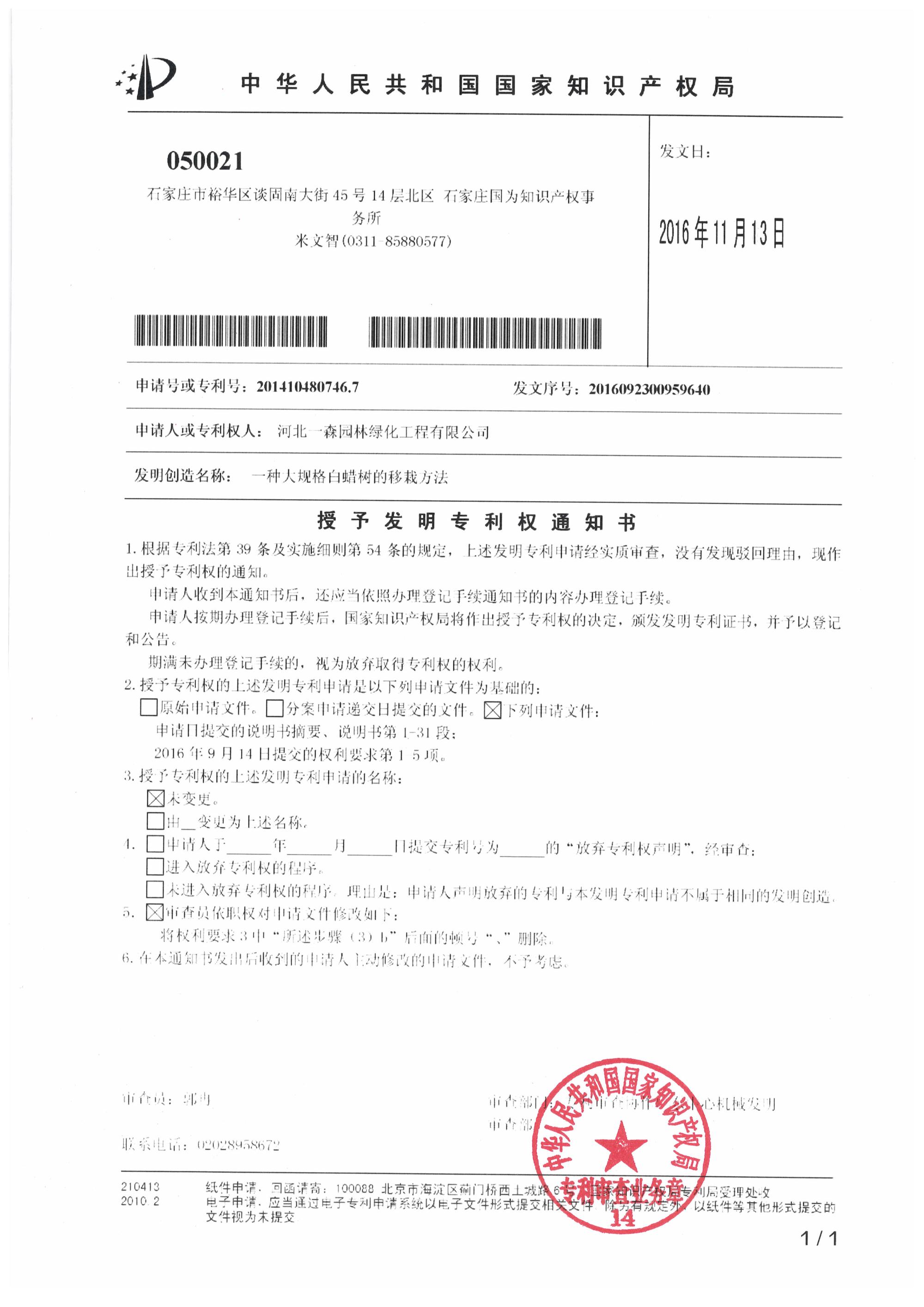 授予發(fā)明專利通知書(shū)