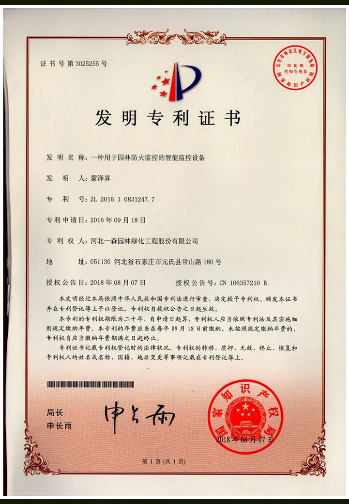 “一種用于園林防火監(jiān)控的智能監(jiān)控設(shè)備”發(fā)明專利證書(shū)